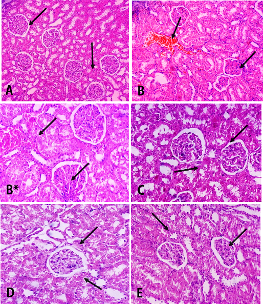 Fig. (2) Photomicrograph of control kidney section 200× showed normal Glomerulus, Bowman’s space and renal parenchyma (A). On the other side, the kidney sections of+ve control exhibited some hyperplastic glomeruli and swollen lining epithelium of the renal tubules (B) Other Photomicrograph of kidney tissue section of revealed proximal convoluted tubules show destructed epithelial lining 400x.(B*) Glibenclamide, revealed almost normal arranged of renal corpuscle with normal glomerulus stained with (H&E) 200x. (C) In group treated with COQ10 in addition to glibenclamide showing normal glomeruli (D). In group treated with vitamin E in addition to glibenclamide showing nearly normal histology (E).