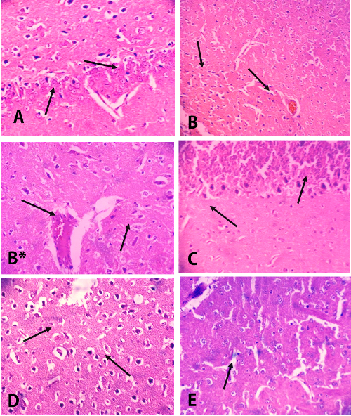 Fig.3: Section of brain showing normal rat (A), Diabetic group (B) and (B*), group treated with glibenclamide (C), group treated with COQ10 in addition to glibenclamide (D), group treated with vitamin E in addition to glibenclamide (E)