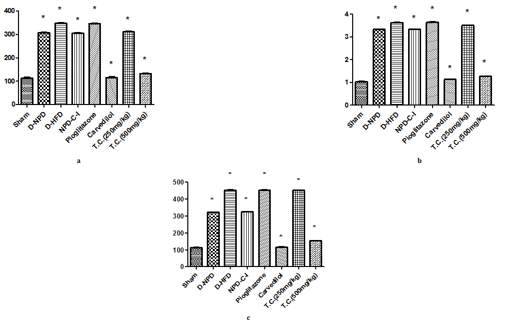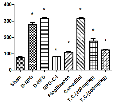 *= p<0.01when comparison is done between Sham and DNPD, DNPD and D-HFD, D-HFD and carvedilol, DHFD and T. chebula (0.25 g/kg), D-HFD and T. chebula (0.05 g/kg) as calculated by one way ANOVA followed by Tukey’s t-test.