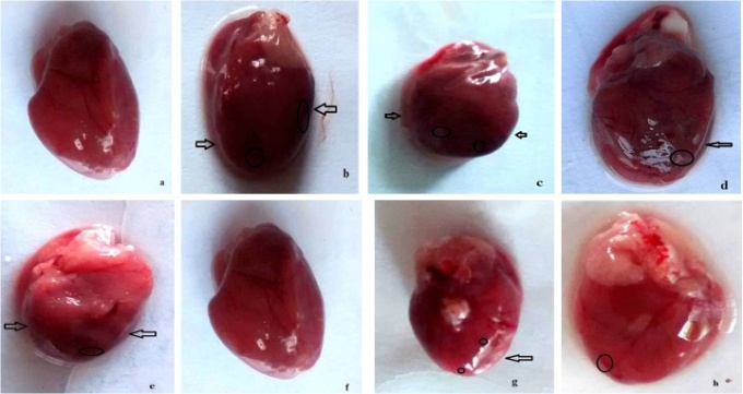 Fig. 3: Assessment and grading of heart (a) Sham (b) D-NPD (c) D-HFD (d) NPD-C-I (e) Pioglitazone (f) Carvedilol (g) Terminalia chebula (0.25 g/kg)(h) Terminalia chebula (0.05 g/kg)