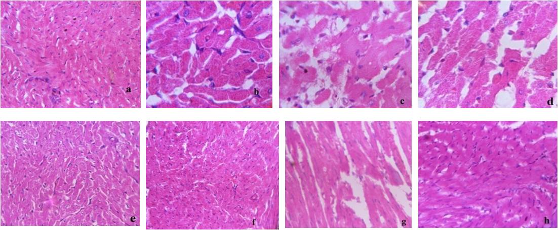 Fig. 5: Photomicrographs of histopathology of rat’s heart of different groups (a) Sham (b) D-NPD (c) D-HFD (d) NPD-C-I (e) Pioglitazone (f) Carvedilol (g) Terminalia chebula (0.25 g/kg)(h) Terminalia chebula (0.05 g/kg)
