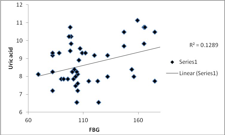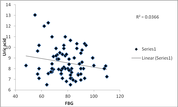 Fig. 1: Relationship between FBG and Uric acid level in the coffee consumers in the diabetic study population