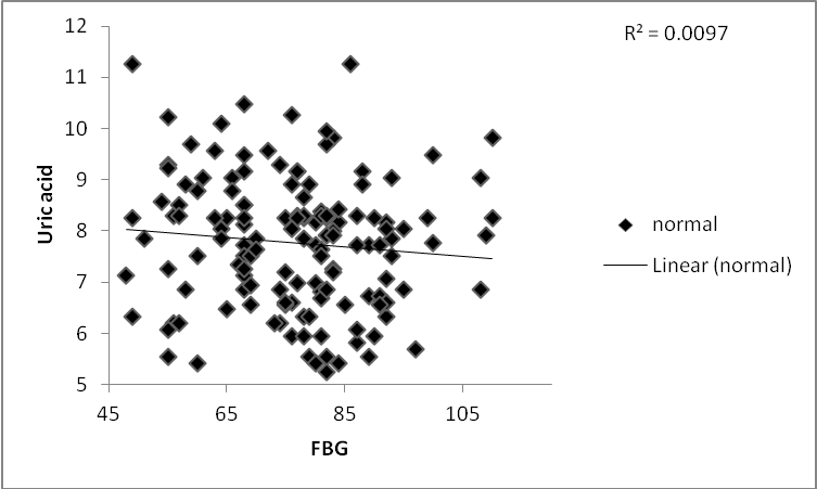 Fig. 4: Relationship between FBG and Uric acid level in the non-coffee consumers in the normal study population