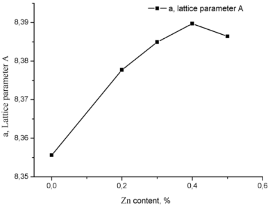 The value of the lattice parameters was calculated from diffraction patterns with the error of (3–4)·10-4Å(fig.2). The lattice constant was found to be increasing with the increase in zinc concentration from x=0 to x=0.4.