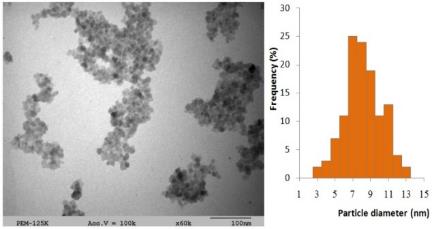 Fig. 4 shows, the TEM image of the particles and their size distribution obtained with a statistic of ~400 particles for the composition with zinc concentration 40 % (ZnMNPs40). The distribution is close to symmetrical, the values of d lie in the range of 3–13 nm, and the average value is ~8.5 nm. In this case, 80% of the particles have the sizes of 6.0–10.0 nm, which agrees with the result obtained by X-ray diffraction.