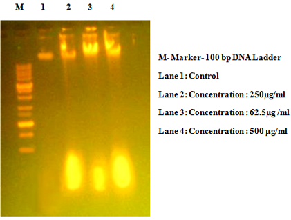 The conventional agarose gel electrophoresis was performed on the cells treated with different concentrations (500μg/ml, 250μg/ml and 62.5μg/ml) of the plant extract for 48 hours (fig. 4). DNA fragmentation which is a typical hallmark of the apoptotic cell death was analysed in the study and found that the wax apple methanolic extract induced an anti-proliferative effect on A549 cells resulting in the degradation of chromosomal DNA into small oligo nucleosomal fragments as seen in Lanes 2, 3, and 4. In Lane 1, it shows the intact chromosomal DNA band of the untreated cells that acts as a control. Higher the concentration (500μg/ml) of the extract induced a greater laddering of DNA when compared to the lower concentration (62.5μg/ml).
