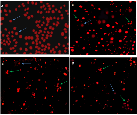 Fig. 5: PI staining to analyze the apoptotic morphology of extract treated and untreated A549 cells. (a) Untreated A549 control cells. A549 cells treated with (b) 62.5μg/ml, (c) 250μg/ml and (d) 500μg/ml. Green arrow indicates apoptotic cells while blue arrow shows normal cells.