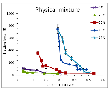 Fig. 4 shows data resulted from the compact ejection force as a function of compact porosity. As expected, ejection forces decreased as porosity increased. In fact, ejection forces of the physical mixtures were higher than those of agglomerate products independent of the level of ACD. The higher plasticity and low surface area of the agglomerates explained this phenomenon.