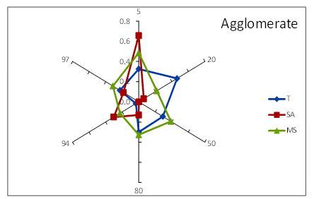 Fig. 5 depicts the lubricant sensitivity of the SOR: ACD composites and fig. 6 illustrate the lubricant sensitivity of pure materials. A low sensitivity to a lubricant is observed for composites having a LS near the center of the radial plot. The magnitude of the sensitivity varied with the ACD level and did not showed any trend. The area under the curve of each radial curve can be considered as indicative of the magnitude of the LS. In this case, the agglomerates showed the same LS for talc and magnesium stearate, but small LS to stearic acid than the physical mixtures. It is possible that stearic acid is able to form a complete particle coating for the physical mixtures and thus, reduced the number of contact points required to form a strong compacts. On the other hand, pure materials, especially, SOR was highly sensitive to lubricants as compared to ACD. In this case, lubricants strongly interfered with bonding forces of SOR such as hydrogen bonding between particles and softened tablets. Therefore, the continuous lubricant film on SOR particles is not destroyed reducing the surface area and thus, weakening particle bonding. However, the contrasting result was found for the brittle deforming ACD. This is explained by the continuous formation of fresh surfaces not coated by lubricant, which bind together reducing slightly LS.