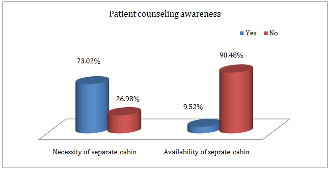 Although, 73.02 % pharmacists were of the opinion that the separate patient counselling cabin is a necessity, only 9.52 % pharmacies were having separate infrastructure for it as shown in fig. 1. Unavailability of separate counselling room due to lack of space or it is not affordable. It is preferred that patient counselling is done in a separate room that ensures comfortable, confidential and safe environment that establish caring relationship between patient and pharmacist. Counselling is more effective in private room that ensures privacy and opportunity to have confidential communication, if the separate room is not available then area can be restructured to minimize visual and auditory privacy from other patients or staff [10, 11].