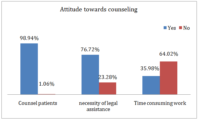 In Indian set up nobody will do the things if there is no act to implement regulations to provide compulsory patient counselling and pharmaceutical care by qualified personnel. So, legal assistance is very much important by enacting a law by the parliament. Because of these lacks of legality towards patient counselling, the effort for popularizing the patient counselling comes to an end. Survey findings revealed pharmacists has awareness regarding importance of patient counselling and are positive for providing counselling services which will improve patient compliance and adherence [12].
