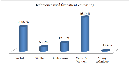33.86 %. 6.35 % and 12.17 % samples showed that they practiced counselling by means of verbal, written and audio-visual techniques respectively, while use of verbal and written techniques in combination was practiced by almost 46.56 % respondents as shown in fig. 4. It has also been shown that the combination of oral and written information is more effective in educating patient it allows the patient to refer to in case they forget any heard information. The use of videos, graphics and other tools could be used to support counselling. Pharmacist was still lacking in the knowledge and importance of audio-visual aids which were most significant aid for patients receiving OTC and for illiterate patients. Concept of medication reminder card still not evidenced [10]. Concept of medication reminder card still not evidenced. Medication reminder cards have proved to be useful for patient medication adherence. Medication information transfer, exchange, education and counselling all were considerable. Of this medication information transfer and counselling were in practice.