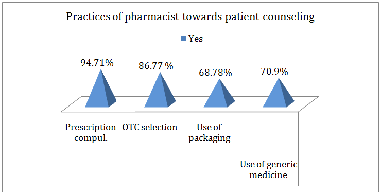Survey finding showed that 94.71% ask for prescription, 86.77%, 97.88%, and 68.78% provided counselling related with rational OTC selection, antibiotics course completion and demonstrate technique for novel packaging respectively as in fig.6. Others were not practicing significantly on these matters [16].