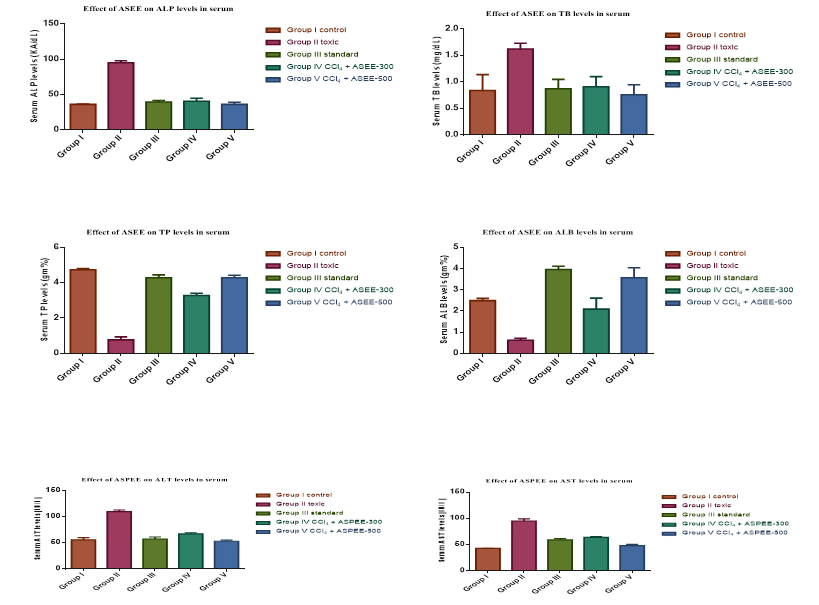 The elevated serum AST, ALT, ALP and TB levels were significantly (P<0.001) reduced by the standard. The test groups ASEE-300 and ASEE-500mg/kg. b. w also exhibit a significant protective effect on the serum levels and also increases the reduced serum TP and ALB levels.