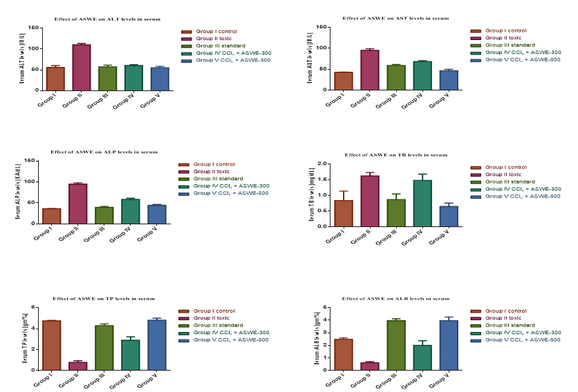 The elevated serum AST, ALT, ALP and TB levels were significantly (P<0.001) reduced by the standard. The test groups ASWE-300 and ASWE-500mg/kg. b. w also exhibits a significant protective effect on the serum levels and also increases the reduced serum TP and ALB levels. The ASWE-500 showed a better hepatoprotective activity (P<0.001) than ASWE-300. The high percentage protection was observed with ASWE-500 was also comparable to the reference standard drug Silymarin with to all the parameters.