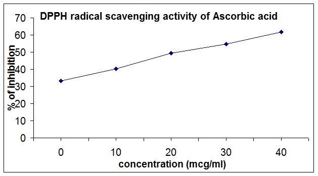 Table. 1. Shows DPPH Radical scavenging activity of the ethanolic, petroleum ether and water extracts of the Alangium salvifolium was compared with those of standard ascorbic acid. The DPPH radical scavenging abilities of the extracts (86.14%) were found to be comparable than those of standerd Ascorbic acid (75.25%).