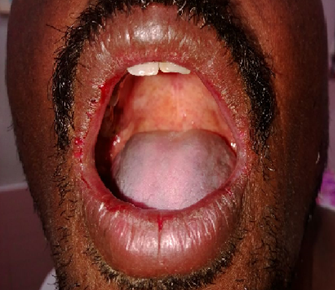 Fig. 2: Haemorrhagic ulcerations of mucosal surface of oral cavity