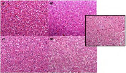 Fig. 1: Optic microscopy from hepatic tissue alterations representative from each treatment group (400x). A) Control group, without changes. B) MTX group, presenting hydropic degeneration and isolated necrosis in hepatocytes. In detail, a fibrotic nodule is evidenced. C) SLM group, presenting cellular tumefaction. D) MTX+SLM group, presenting cellular tumefaction and isolated necrosis in hepatocytes