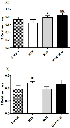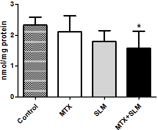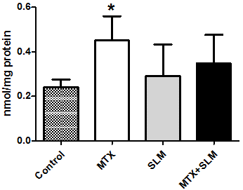 Methods: Male Wistar rats were treated by gavage for 4 weeks as followed: Control (saline solution, daily), MTX (900µg/kg, once a week and daily with saline solution), SLM (50 mg/kg, daily) and MTX+SLM (MTX 900µg/kg, once a week, SLM 50 mg/kg, daily).