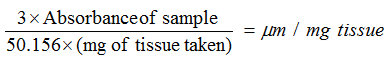 Procedure: 0.5 ml of PMS was taken and to it was added 0.5 ml of Tris hydrogen chloride buffer and incubated at 37◦C for 2 h and then 1 ml of ice cold trichloroacetic acid was added, centrifuged at 1000 rpm for 10 min. From the above, 1 ml of supernatant was taken and added 1 ml of thiobarbituric acid and the tubes were kept in boiling water bath for 10 min. The tubes were removed and brought up to room temperature and 1 ml of distilled water was added. Absorbance was measured at 532 nm by using a UV–VIS-spectrophotometer.