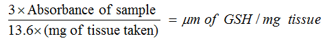 Procedure: 0.75 ml of PMS was mixed with 0.75 ml of 4% sulfosalicylic acid and then centrifuged at 1200 rpm for 5 min at 4◦C (REMI CM-12). From the above, 0.5 ml of supernatant was taken and added to 4.5 ml of 0.01M DTNB. Absorbance was measured at 412 nm by using a UV–VIS-spectrophotometer.