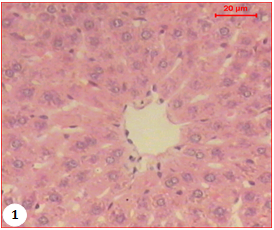 Fig. 3: Micrograph of liver of rat traded with hot extract shows normal structure of the hepatic lobule, (H & E X 150) |
