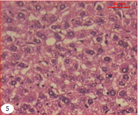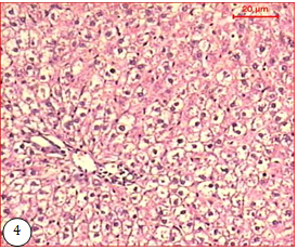 Fig. 4: Micrograph of liver of HC shows fatty change of the hepatic lobule and hydropic degeneration (H & E X 150) |