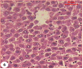 Fig. 6: Micrograph of liver of HC treated with hot extract shows normal structure of the hepatic lobule (H & E X 150) |