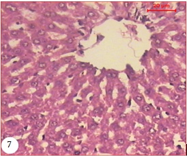 Fig. 7: Micrograph of liver of HC treated with the reference drug shows normal structure of the hepatic lobule. Notice the few fatty vacuoles (H & E X 150) |