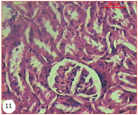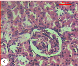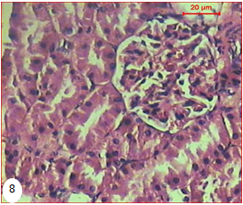 Normal control kidney (fig. 8), revealed normal histology of the glomerulus, well-spaced tubules and normal orientation of nephrons with adequate glomeruli. Similar results were obtained for cold and hot algal extracts administered to normal healthy rats (Fig.9, 10).