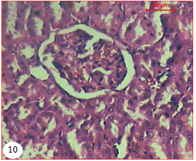 Fig. 10: Micrograph of kidney of rat treated with hot Extract shows the normal structure of the glomerulus and the renal tubules (H & E X 150) |