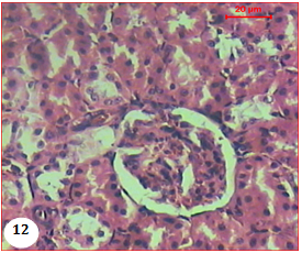 Fig. 12: Micrograph of kidney of HC-rat treated with Cold Extract showing normal structure of the glomerulus and the renal tubules (H & E X 150) |