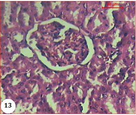 Fig. 13: Micrograph of kidney of HC-rat treated with Hot Extract shows the normal structure of the glomerulus and the renal tubules (H & E X 150) |