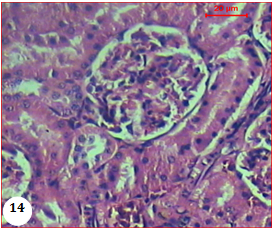 Treatment of HC-rats with algal extracts and fluvastatin showed, milder tubular injury, no glomerular or tubular alterations, no basement membrane thickening and fibrosis were discerned. Furthermore, normal histology of the glomerulus with well-spaced tubules, no congestion, and no inflammation was detected (fig. 12, 13 and 14 respectively).