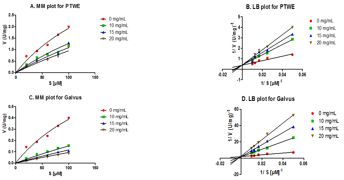 It has already been reported in previous papers that Galvus (Vildagliptin) is a reversible competitive inhibitor of DPP-IV [8]. Through in vitro analysis by the graph pad prism and sigma plot, PTWE was also found to be a competitive inhibitor (Fig.1) having Vmax (5.931 U/mg), Km (207.7 µM), Ki (13.11 mg/ml) and Kcat (28.6 x 10-3). The Vmax, Km, Ki and Kcat value for galvus is 1.124 U/mg, 190.7 µM, 4.232 mg/ml and 5.9 x 10-3. Therefore, the catalytic efficiency (Kcat/Km) of an enzyme is 4.43 fold greater in PTWE inhibited reactions and also having 3 fold greater Ki compared to galvus inhibited reactions (table 1).