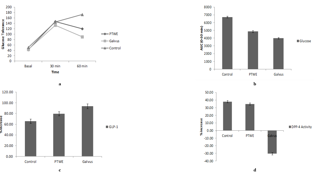 Results: PTWE has given the IC50 value of 17.4 mg/ml and was found to be a competitive inhibitor having the Ki value of 13.11 mg/ml. Plasma GLP-1 concentration was increased and DPP-IV activity was decreased after 60 min of glucose load in PTWEtreated rats as compared to control rats. Overall PTWE was found to be less potential DPP-IV inhibitor than Galvus.