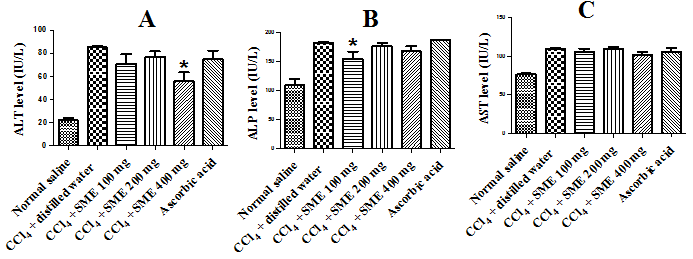 The SME–treated rats had reduced levels of liver enzymes; however, only ALP and ALT for SME 100 and 400 mg/kg respectively were significantly (P<0.05) reduced (table 5, fig. 1). In addition, there were observed a substantive non-dose related decrease in the values of ALP, ALT and AST in the SME treated groups. Furthermore, SME 400 mg/kg treated rats had the lowest levels of ALT and AST.