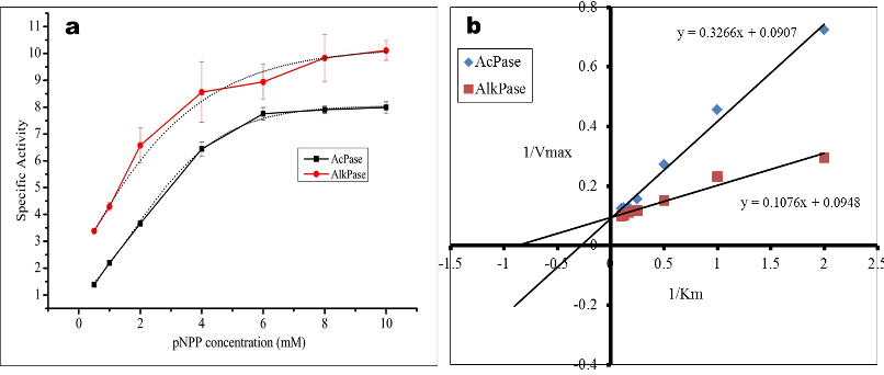 Fig. 4: Graphical representation of (a) effect of substrate concentrations on AcPase and AlkPase activity and (b) Lineweaver-Burk plot showing the Km and Vmax values of control F. buski