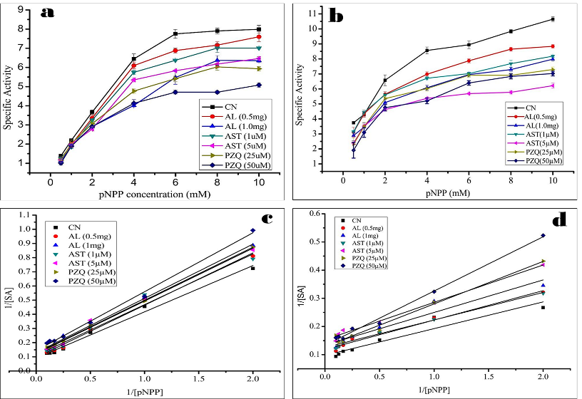 Fig. 6: Graphical representations on the effects of ethanol extract of A. nigra (0.5 and 1 mg/ml), astragalin (1 and 5 µM) and praziquantel (25 and 50 μM) on (a) Acid phosphatase and (b) Alkaline phosphatase activity with increasing pNPP concentrations, and Lineweaver-Burk plots showing altered kinetic parameters of (c) Acid-and (d) Alkaline phosphatase in the F. buski on treatment with the A. nigra (ethanol extract), astragalin and PZQ
