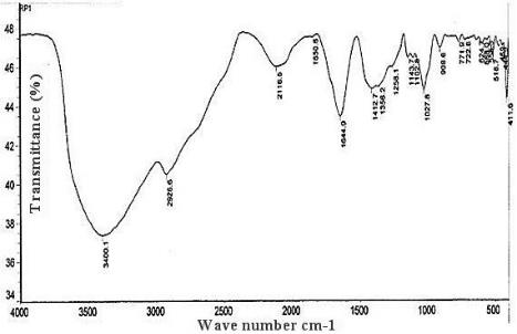 FTIR analysis was used to identify the molecules, proteins and functional groups involved in the reduction of silver ions into silver nanoparticles and stabilize them as capping agent. The dried, powdered sample of silver nanoparticles showed the presence of two types of vibrations (i.e. stretching and bending) in the wavelength range of 4000 to 500 cm-1. The presence of an amine vibration band at 3400 cm-1 representing a primary amine group (N-H) stretching and amide (N-H) bending vibration bands at 1650 and 1644 cm-1 [21]. Furthermore, the FT-IR spectra of biologically synthesized silver nanoparticles also revealed peaks at 2026 and 2116 cm-1 stretching vibrations of aliphatic C-H bonds.