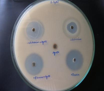It is surely understood that Ag-particles and Ag-based mixes have strong antimicrobial impacts [26] and number of microorganisms have developed medication resistance over numerous eras. Up to this point, these antimicrobial specialists in view of chemicals have been viable for treatment notwithstanding, they have been restricted to use for therapeutic gadgets and in prophylaxis in antimicrobial offices. In this way, an option approach to beat the medication resistance of different microorganisms is required urgently, particularly in therapeutic gadgets, and so forth. Silver nano particles particles and silver salts have been utilized for quite a long time as antimicrobial specialists in different fields on account of their development inhibitory limit against microorganisms. The system of the inhibitory impacts of silver nano particles on microorganisms is partially known. A few studies have reported that the positive charge on the silver nano particles is significant for its antimicrobial movement through the electrostatic fascination between negative charged cell layers of microorganism and positively charged nanoparticles [27, 28]. The combined effect of these nanoparticles with antibiotics was investigated against S. typhi and S. paratyphi using the disk diffusion method. The diameter of inhibition zones (in millimeters) around the different antibiotic disks with or without silver nano particles against test strains. The anti bacterial activity of ceftriaxone and ofloxacin increase in the presence of silver nano particles against test strains the increase in synergistic effect may be caused by the bonding reaction between antibiotic and nano silver. As the antibiotic molecules contain many active groups such as hydroxyl and amido groups, which reacts easily with nano silver by chelation. More recently, Batarseh research showed that the bactericidal effect was caused by silver (I) chelating, which prevents DNA from unwinding [29]. The antibacterial activity of ceftriaxone and ofloxacin were evaluated with a diameter of inhibition zones for the test bacteria (S. typhi and S. para typhi). The antibacterial activity of ceftriaxone and ofloxacin increased significantly in the presence of silver nanoparticles (fig. 6).