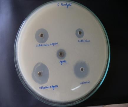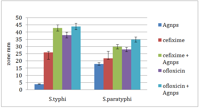 It was found that the silver nanoparticles produced from Trametes sp. enhanced the reaction rates of the antibiotics in a synergistic mode as well as in its own way on these pathogens. In both the cases of S. typhi and S. paratyphi the highest zone of inhibition was found in the combination of ofloxacin+silver nanoparticles followed by ceftriaxone+silver nanoparticles, ofloxicin, ceftriaxone and silver nanoparticles. (fig. 7).
