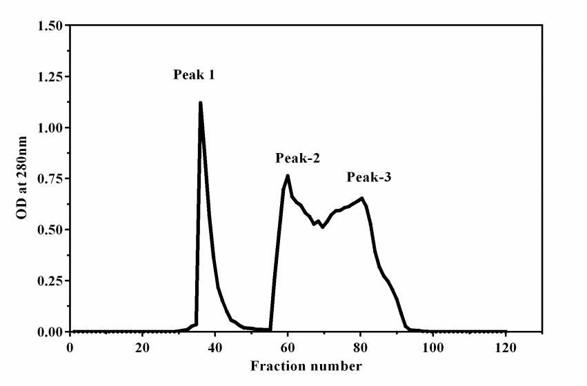Fig. 1: Sephadex G-75 elution profile of Western region Naja naja venom. The column was pre-equilibrated with 50 mM sodium acetate buffer. 140 mg of Naja naja venom was dissolved in 1 ml (w/v) of equilibrated buffer and loaded on Sephadex G-75