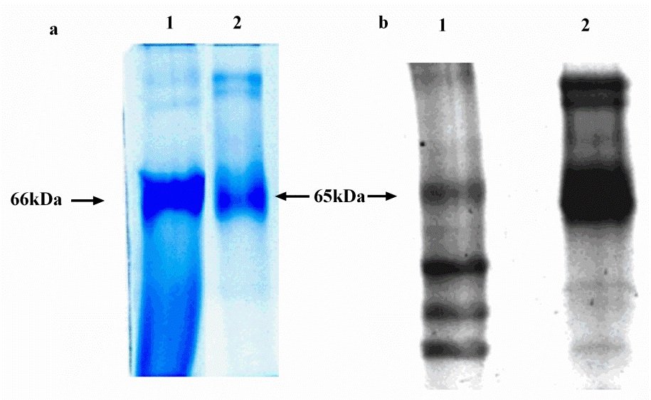 a. SDS-PAGE (Non Reducing) of LAAO at 10 % gel. Lane: 1-BSA (25µg), Lane: 2-PI (20µg). b. Acidic-PAGE of LAAO at 10 % gel. Lane: 1-N. naja crude venom (10 µg), Lane 2-PI (10 µg)