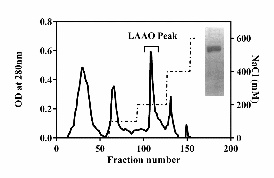 Conclusion: LAAO has promising therapeutic prospects because of its effects on various biological functions. Variation in snake species and their geographical distribution also contributes to the venom properties such as composition, toxicity level, pharmacological and biological activities. The significant difference in protein profiling leads to substantial lethality among different geographical regions. Thus in this study Indian Cobra (Naja naja) venom from the western region of India was subjected to purification of LAAO and biochemical characterization.