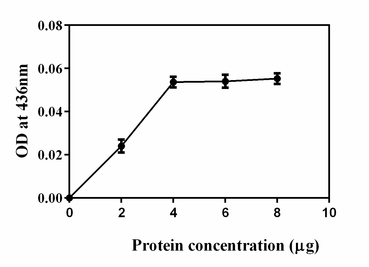 Fig. 5a: Effect of Enzyme concentration. Different concentration (0-8µg) of LAAO was incubated with the reaction mixture for 30 min at 37 °C and activity was observed at 436 nm. Values represent the arithmetic mean and SD (n=3)