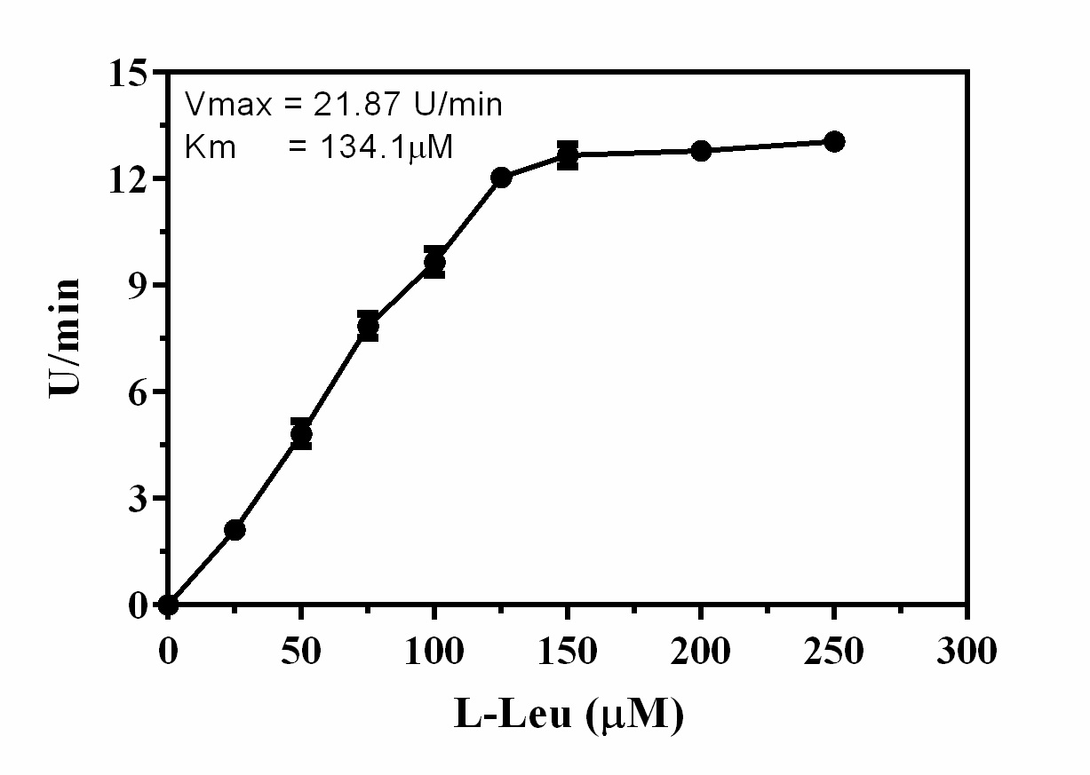Fig. 5b: Effect of substrate concentration on different concentration (0-200µM) of L-Leu was incubated with the reaction mixture for 30 min at 37ºC. Values represent the arithmetic mean and SD (n=3)