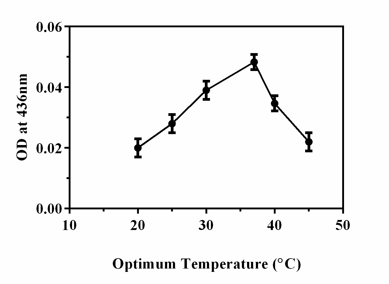 Fig. 5c: Effect of Temperature on LAAO activity. Reaction mixture was incubated at different temperatures for 30 min, activity was observed at 436 nm. Values represent the arithmetic mean and SD (n=3)