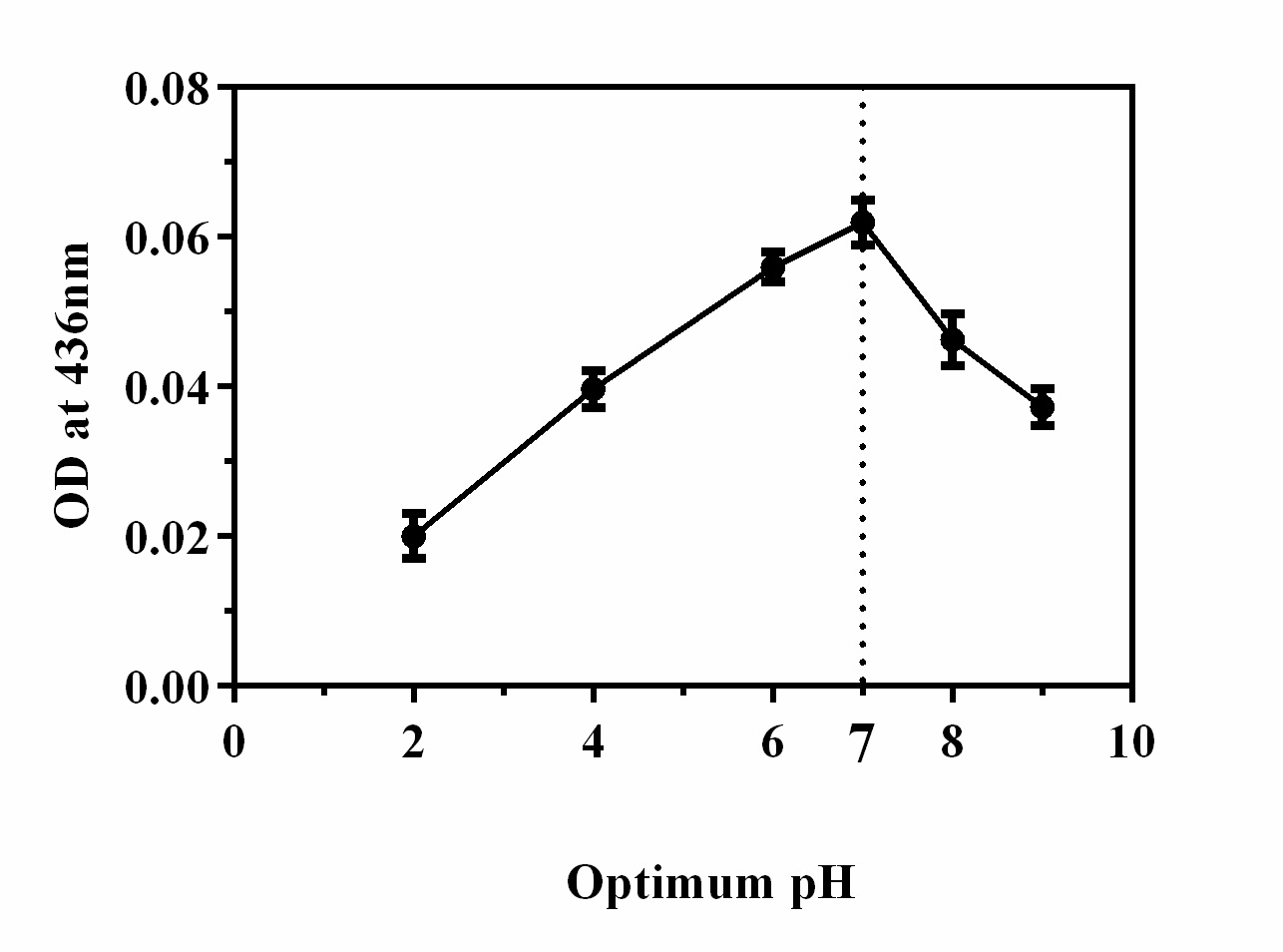 Fig. 5d: pH Effects on LAAO activity. Reaction mixture was incubated with buffers ranging in pH from 2.0-9.0 for 30 min and absorbance was read at 436 nm. Values represent the arithmetic mean and SD (n=3)