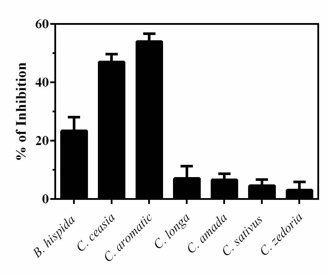 Fig. 6: Inhibition study of LAAO using cold extracts of Benincasa hispida, Curcuma ceasia, C. zedoria, C. aromatic, C. longa, C. amada, and Cucumis sativus. Values represent the arithmetic mean and SD (n=3)